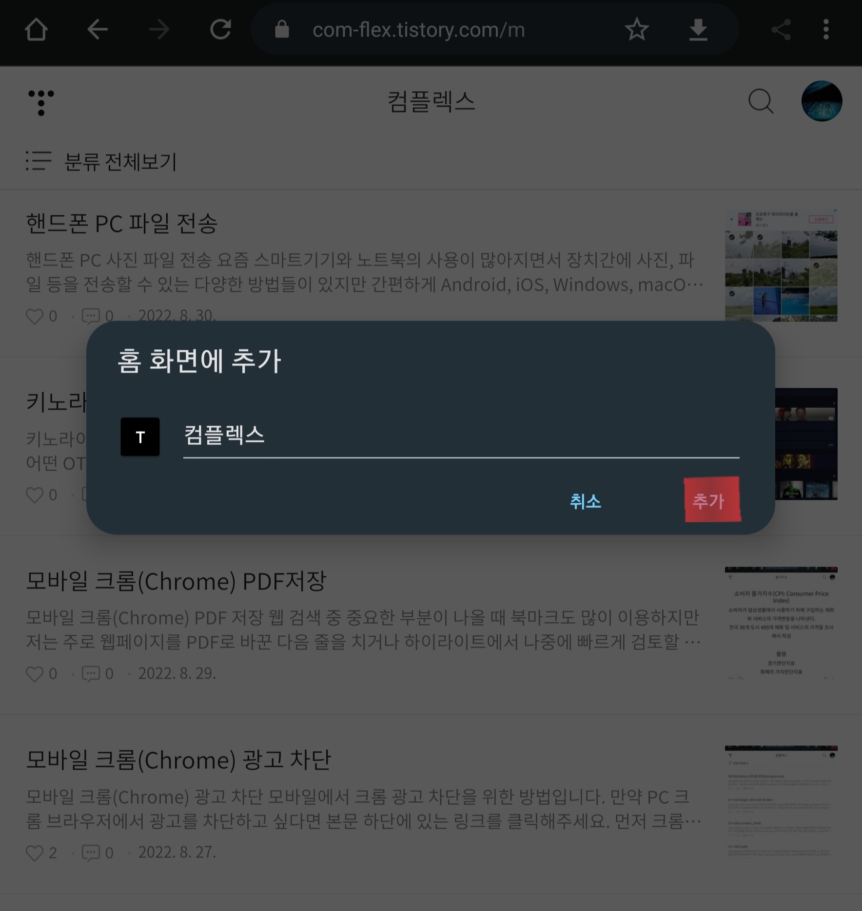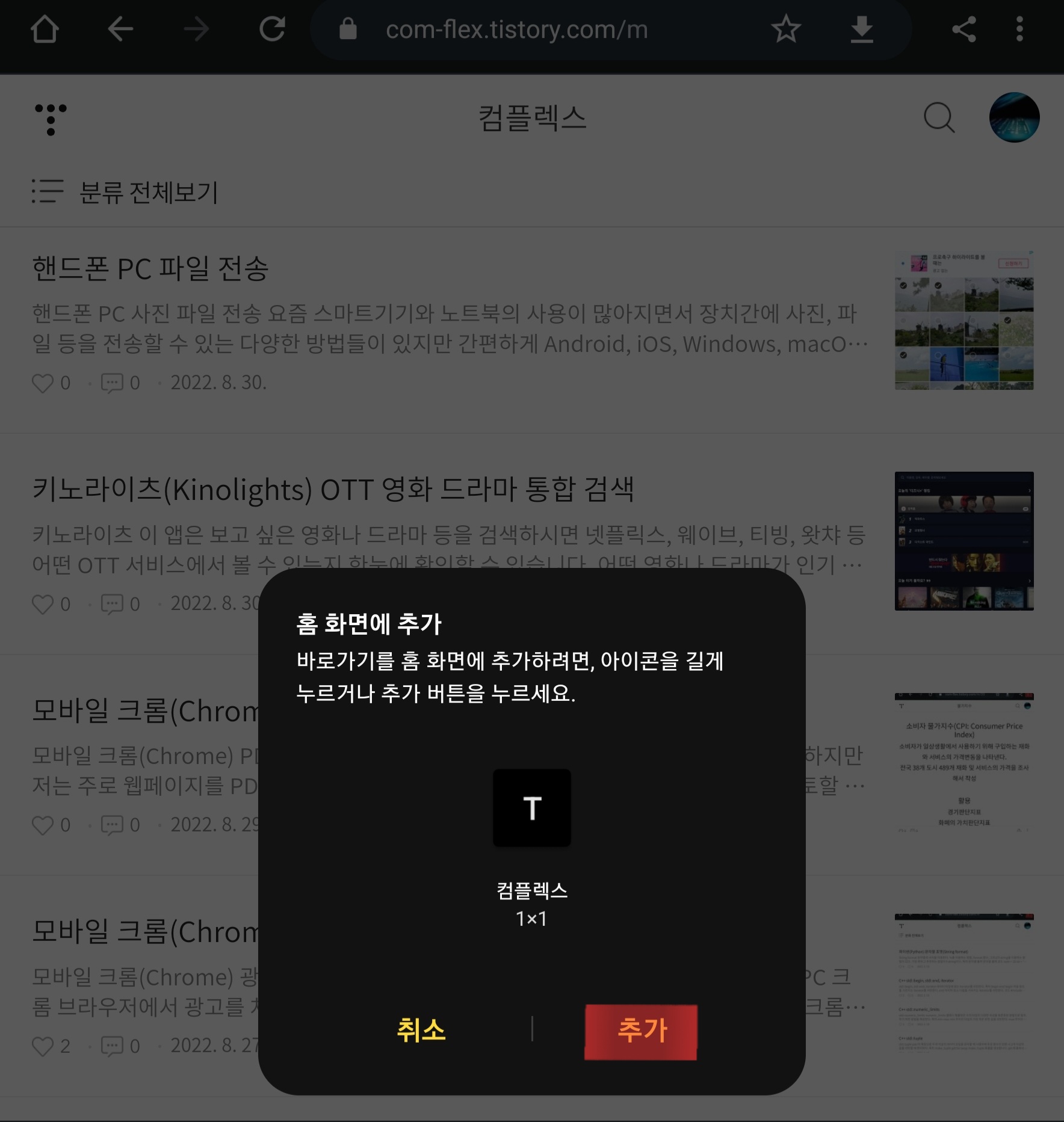 추가 버튼을 클릭하면 홈 화면에 바로가기 아이콘이 생성됩니다.
